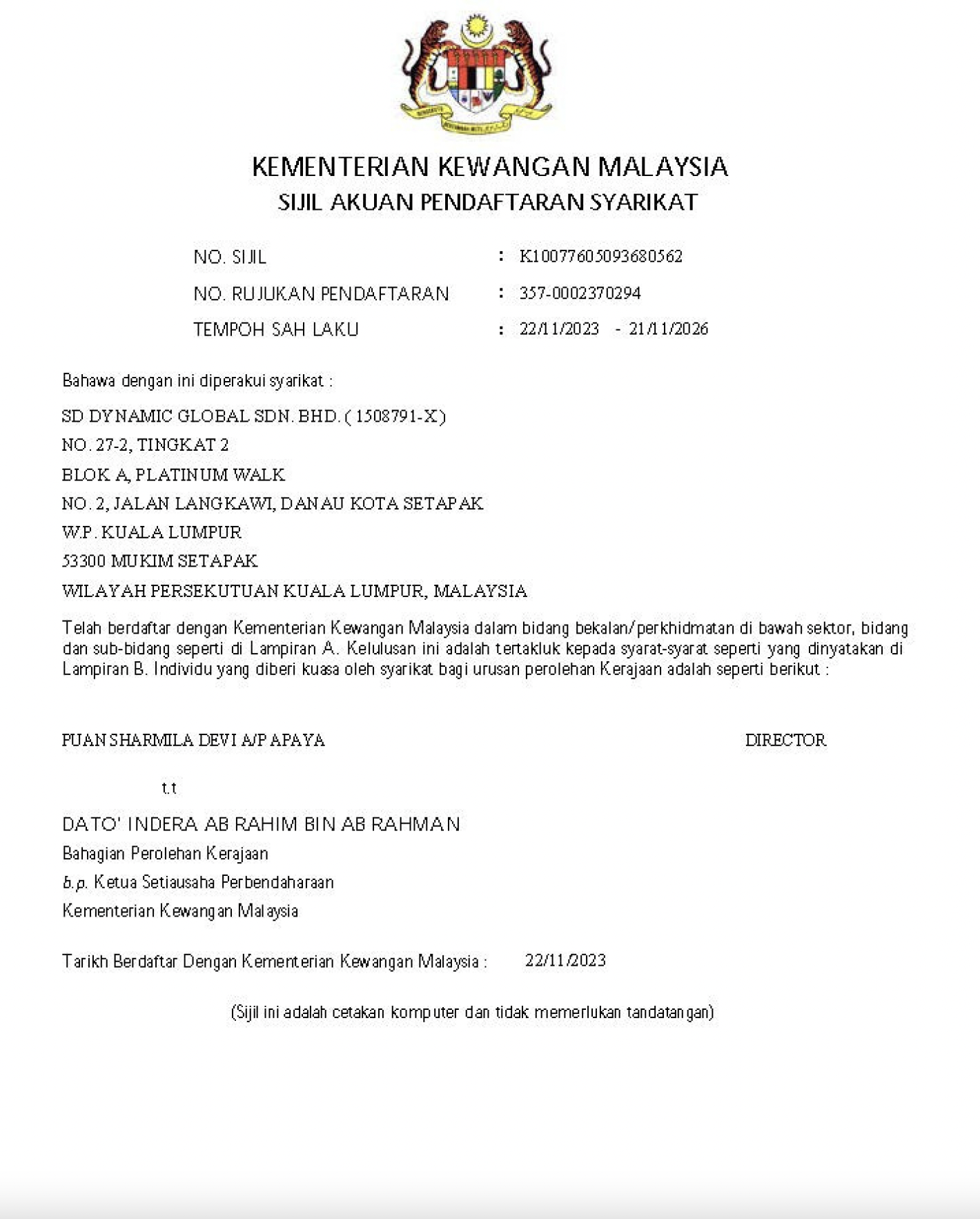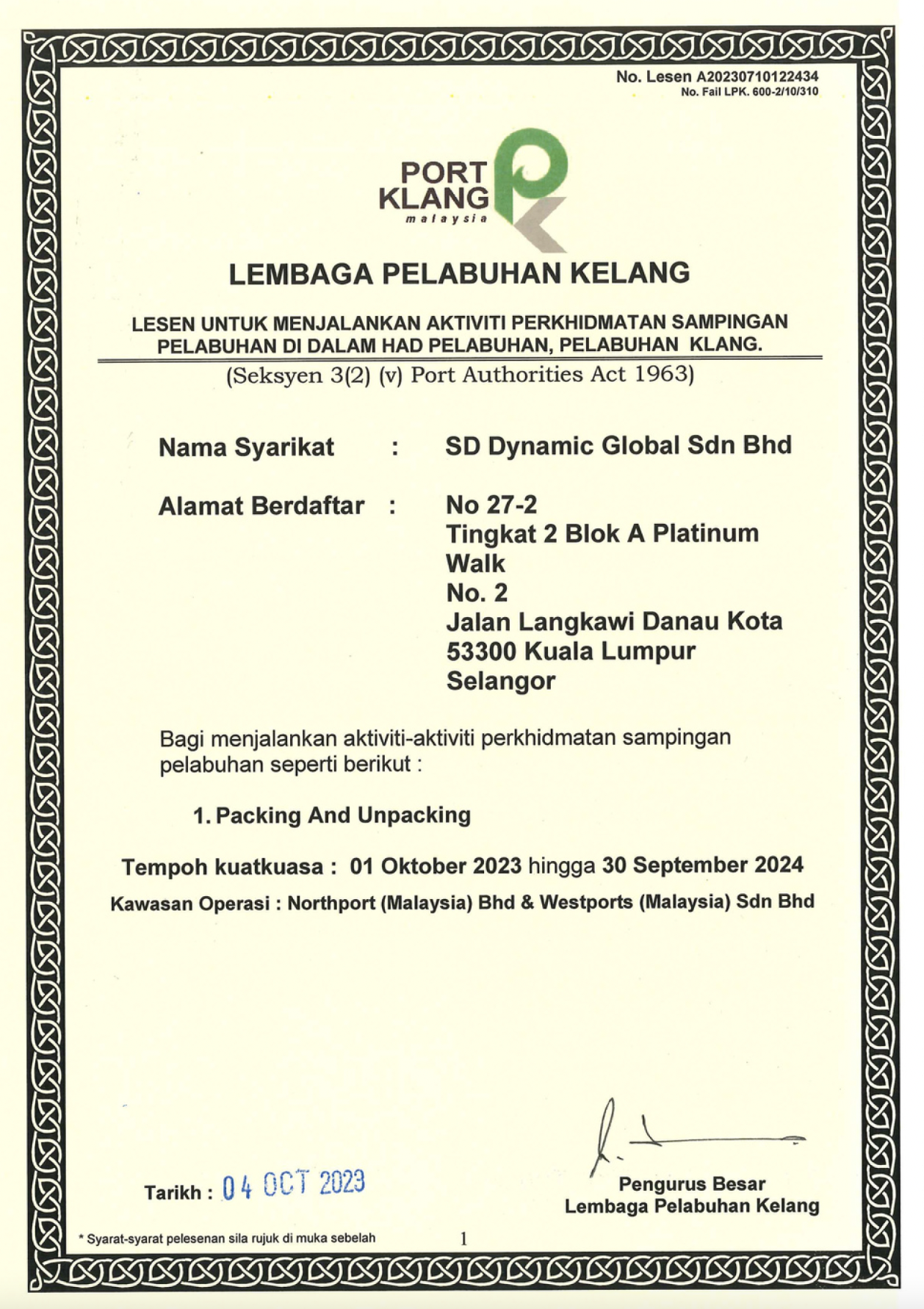 SD Dynamic Global Sdn. Bhd. was incorporated on 18 April 2023 and officially licensed by Port Klang Malaysia on October 2023. The headquarter is located in Setapak, Kuala Lumpur with paid up capital of RM 500,000.00.